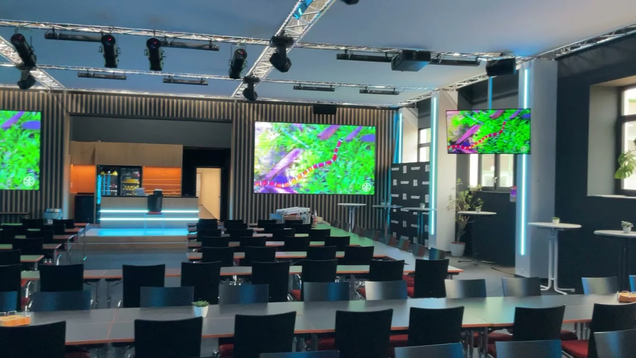 Die Displays sind von unseren Partnern Philips und Sony, die Übertragung im Netzwerk haben wir mit Lindy TX RX Extender 4K realisiert und die Steuerung kommt vom dänischen Partner neets. Natürlich hat das Ganze auch Sound, wie man auf dem Video hören kann. Der kommt standesgemäß aus einer Bose-Anlage.